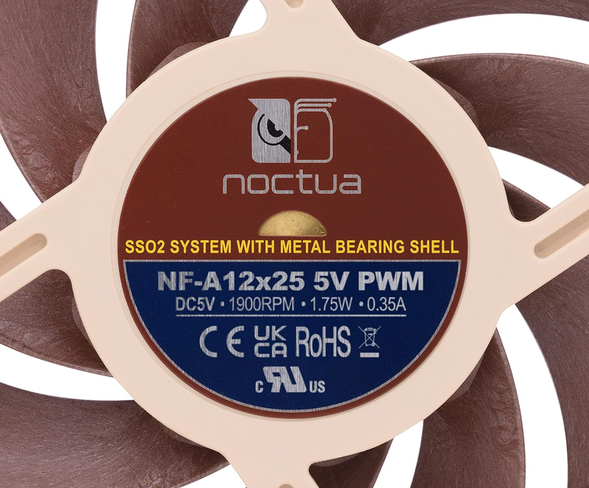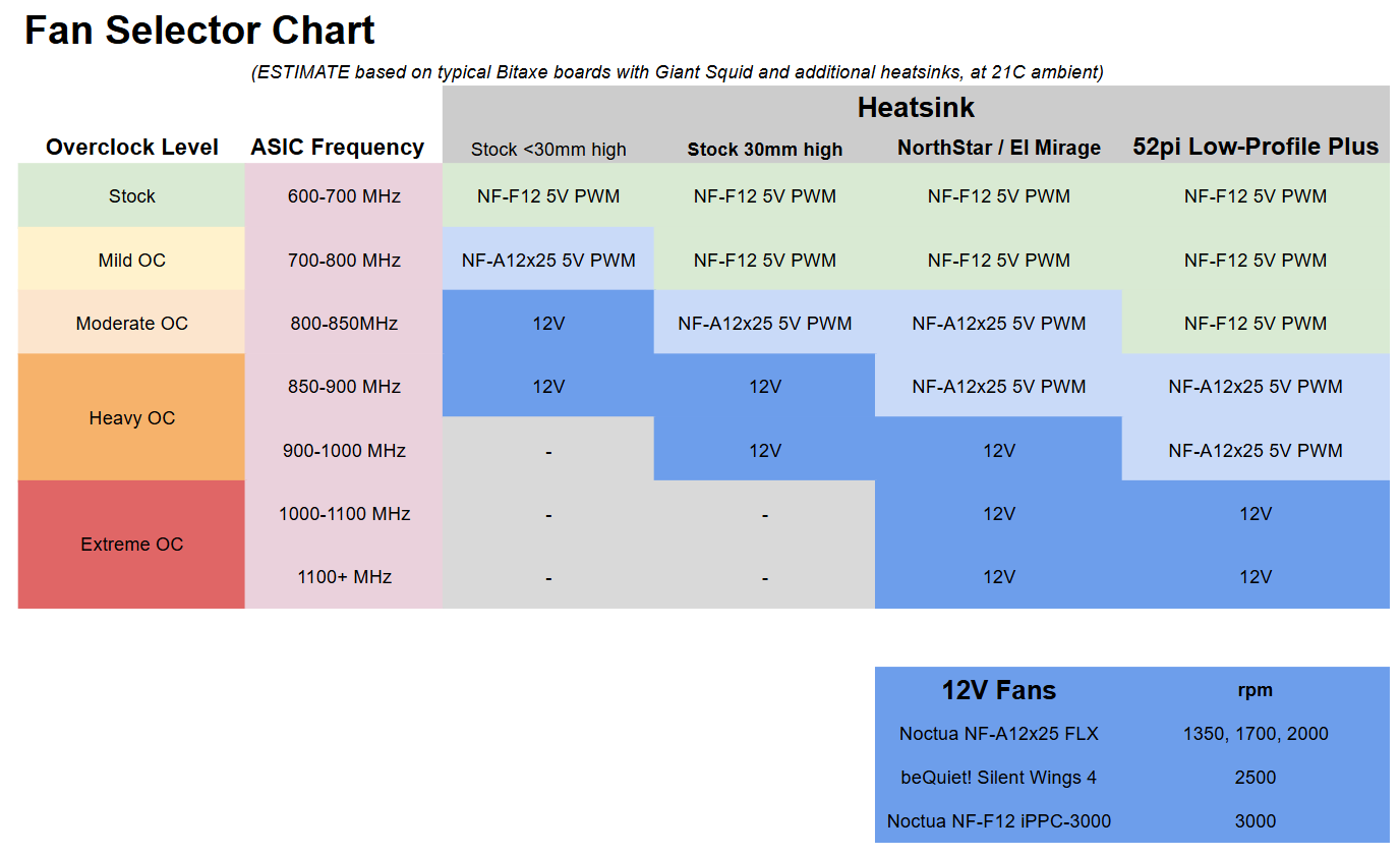 - 500 - 900Mhz - the NF-A12x25 5V PWM (0-1900rpm) is extremely quiet at stock settings and a low woosh at full speed. Plugs directly into the Bitaxe for automatic speed control. Higher static pressure for restrictive heat-exchanger styles like the 52pi Low-Profile Plus.